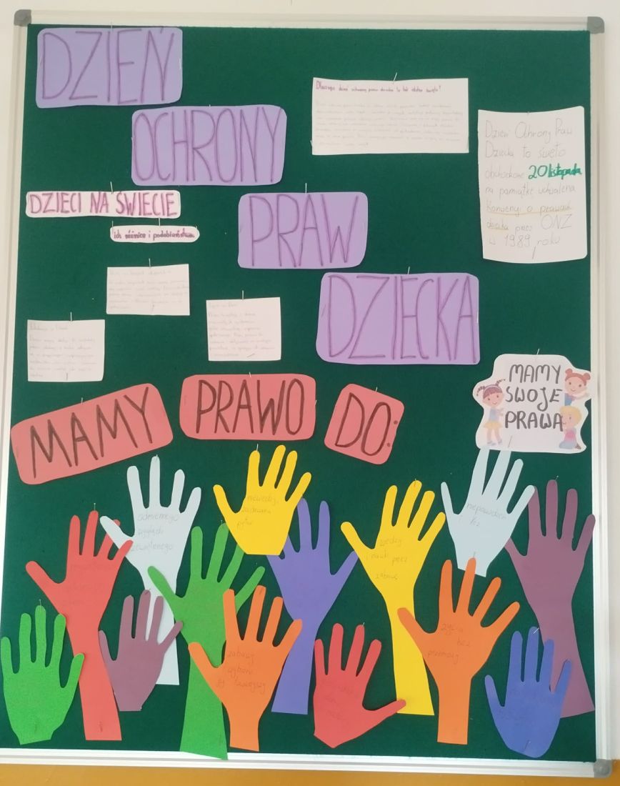 W związku z tym że 20 listopada obchodzilismy Światowy Dzień Ochrony Praw Dziecka, temat ten został wybrany do przedstawienia na gazetkach klasowych. Dodatkowo był kontynuacją tematu z poprzedniego miesiąca - Przeciwdziałania Przemocy Wobec Dzieci. Oba tematy są trudne i ważne. Wszystkie klasy stanęły na wysokości zadania i przygotowały ciekawe gazetki. Klasa 7 połączyła tematykę praw dziecka z prawami człowieka (Dzień Praw Człowieka, który obchodziliśmy 10 grudnia) i akcją Maratonu Pisania Listów Amnesty International (w akcji tej nasza szkoła bierze udział nieprzerwanie od kilkunastu lat).